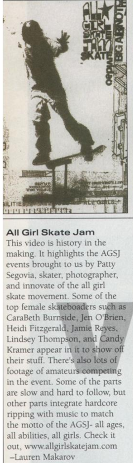 The AGSJ production coordinator, Julie Gengo was quoted as saying “We’ve had to battle through a lot to get sponsorship, because of the attitude that ‘There’s no girls who skateboard’” and Segovia replied, “But we knew the girls were out there.” A shout out was given to Florida skaters Jen O’Brien of Daytona Beach and Elissa Steamer of Fort Myers, including photos (above).