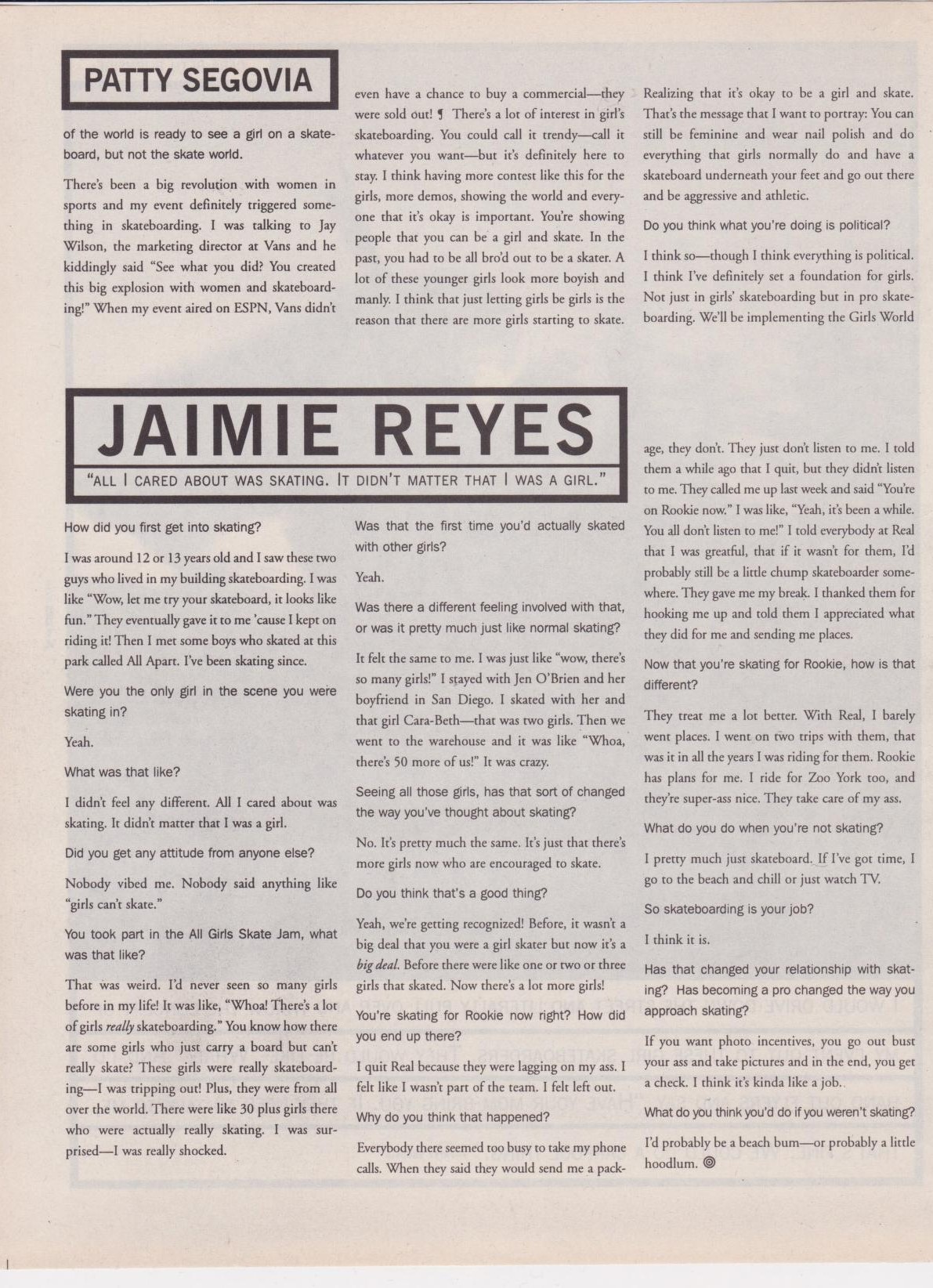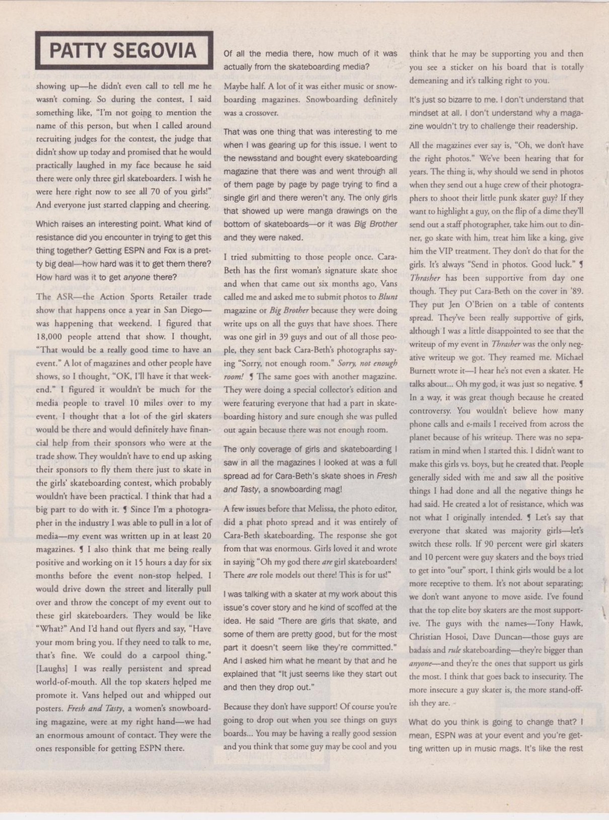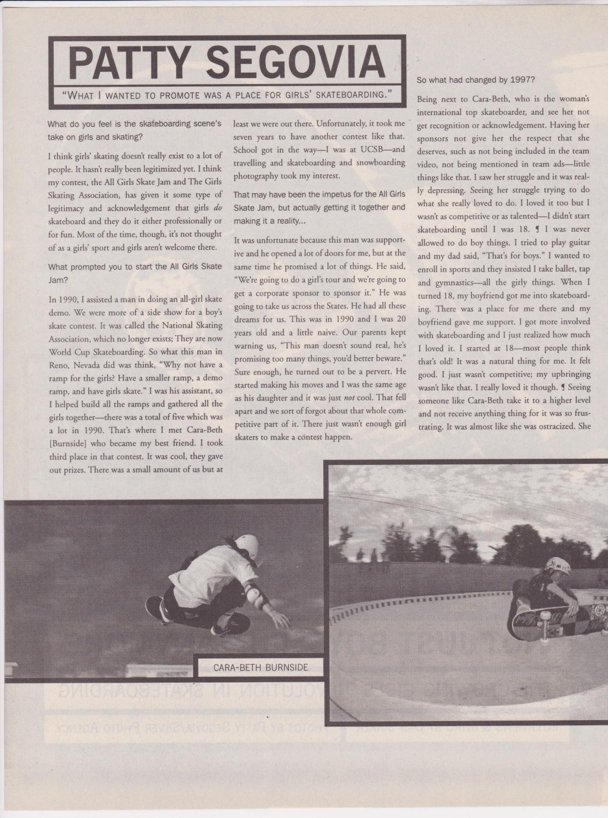 The Los Angeles Times wrote a piece on September 6, 1998 called “The Changing Roll of Women in Sports” by Rose Apodaca Jones. Segovia states that, “It’s no longer taboo for girls to be on a skateboard.” And when asked if a girls’ contest was contributing to gender segregation she said, “They’ve driven me to create a separate entity… It won’t be forever though. When girls catch up and get recognized, it’ll only make the sport of skateboarding better as a whole.”