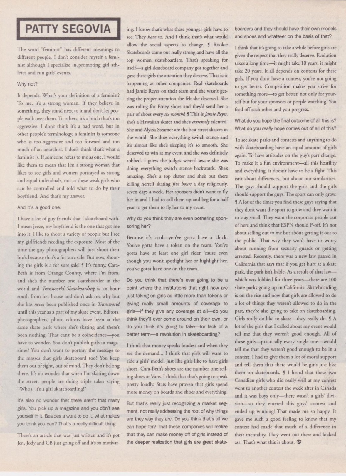 In conclusion, going back to the Punk Planet interview in 1998, you can see how well Patty knew the skateboard industry. She said, “I think that it’s going to take a while before girls are given the respect that they really deserve. Evolution takes a long time – it may take 10 years, it might take 20 years. It all depends on contests for these girls. If you don’t have a contest, you’re not going to get better. Competition makes you strive for something more – to get better, not only for yourself but for your sponsors or people watching. You feed off each other and you progress” (Sinkler).
