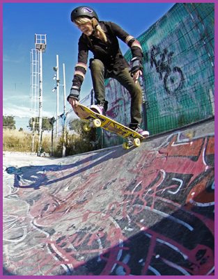 For Àngels, 2009 was a special year for her because it was thanks to a website called 40sk8.com by Alfredo Prados that she reconnected with some of her early skateboarding friends after thirty years. They had a reunion which inspired Àngels to take up skateboarding again and buy a board at age 44! She described the reunion as “the ultimate expressions of indescribable happiness” (Prados) and it was her intention to keep on skateboarding for as long as possible.