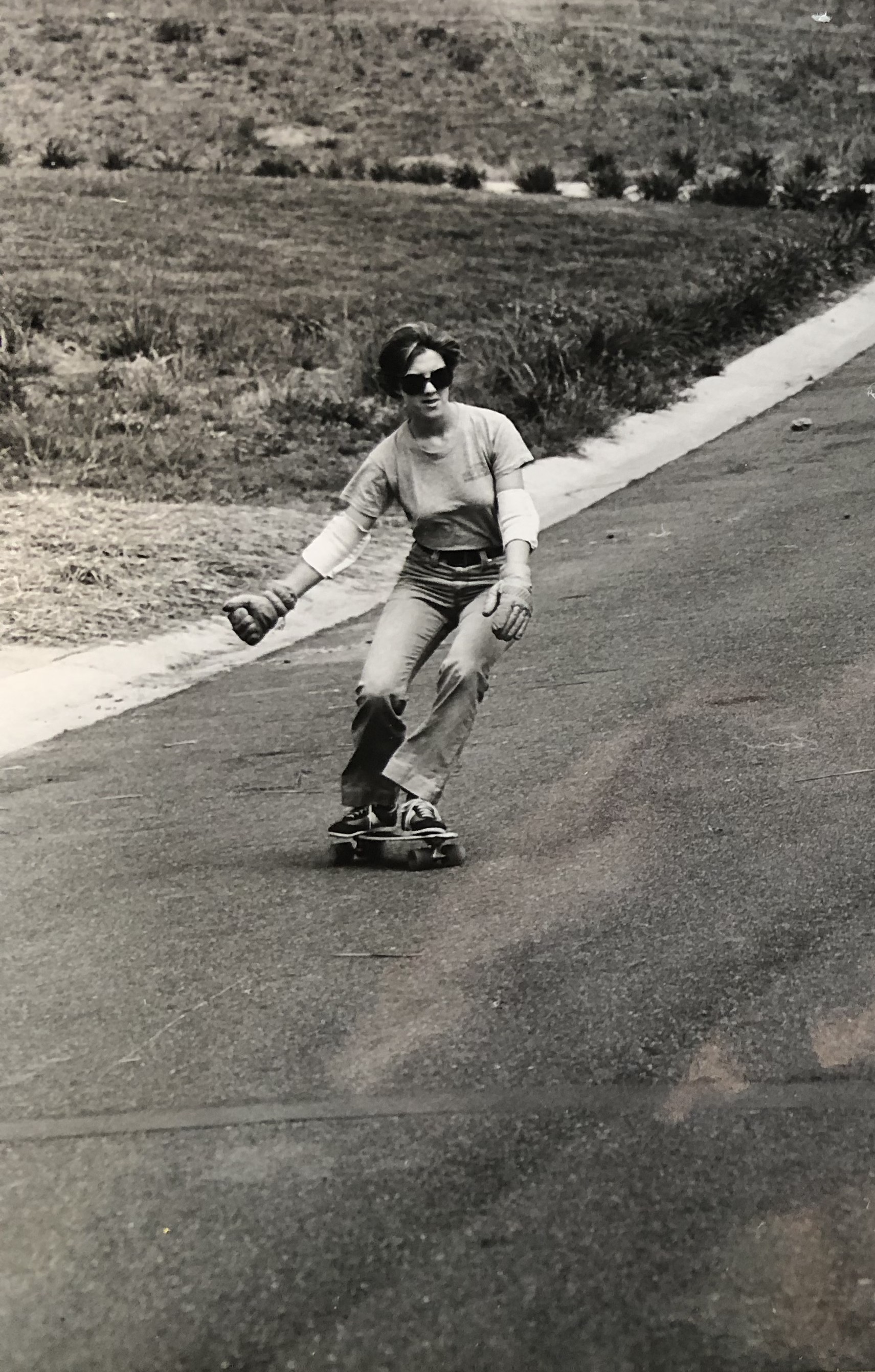 Pete replied to my email and wrote that, “I began dating [Jane] in 1967, and being a surfer and skater, I introduced her to both sports. Being a bit of a dare devil, she dabbled in both, almost immediately. She really took to skateboarding, and although she took some serious wipe-outs on the concrete, adapted well to riding the streets.”