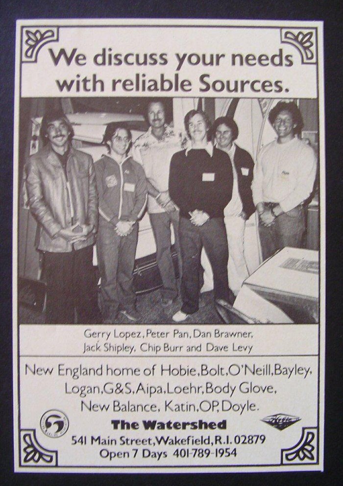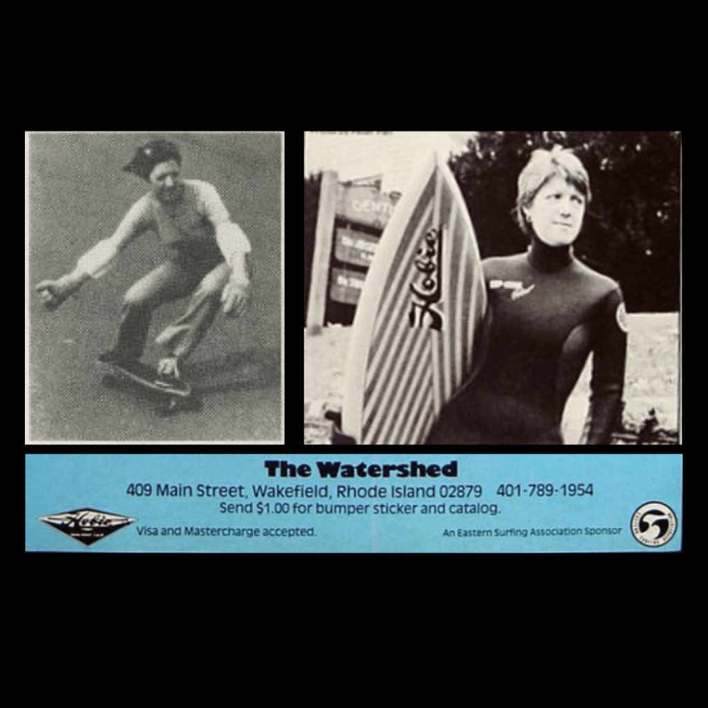 According to the History page for the Narragansett shop, “When urban renewal leveled Beach Street in 1971, Peter Pan moved the shop franchises to his house, close by. For several years, under the name Gansett Surf Supplies… He then partnered with Dave Levy, who was a top lifeguard at the town beach, and continued to supply Hobie surfboards, skateboards, and wetsuits to local clientele.” Finally, in 1976 Levy and Pan launched Watershed Surf Shop on Main Street in Wakefield becoming the top Hobie dealer on the east coast.