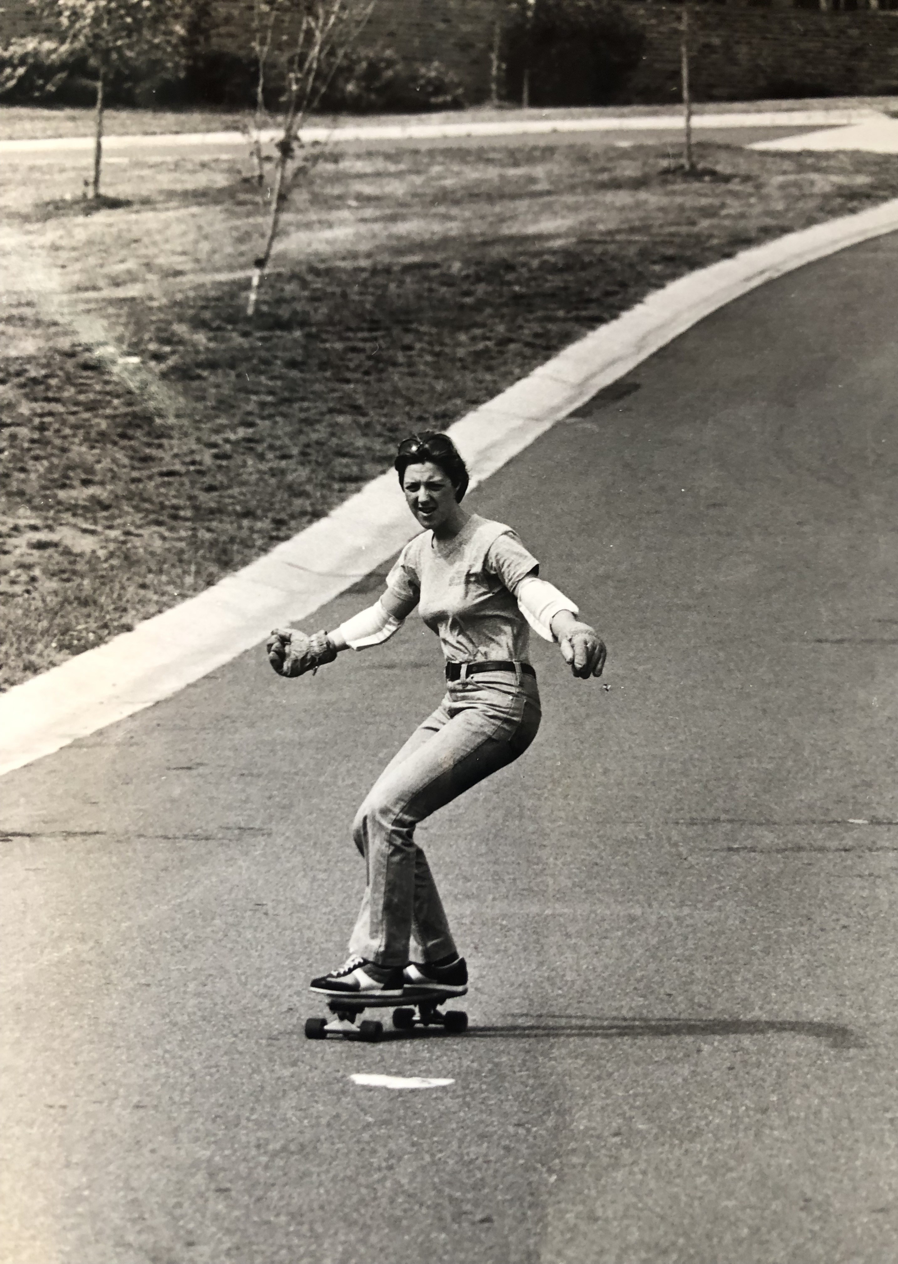 In the Thrasher photograph, Jane appears ready to rip, wearing heavy gloves and makeshift elbow pads, evidently gaining speed.