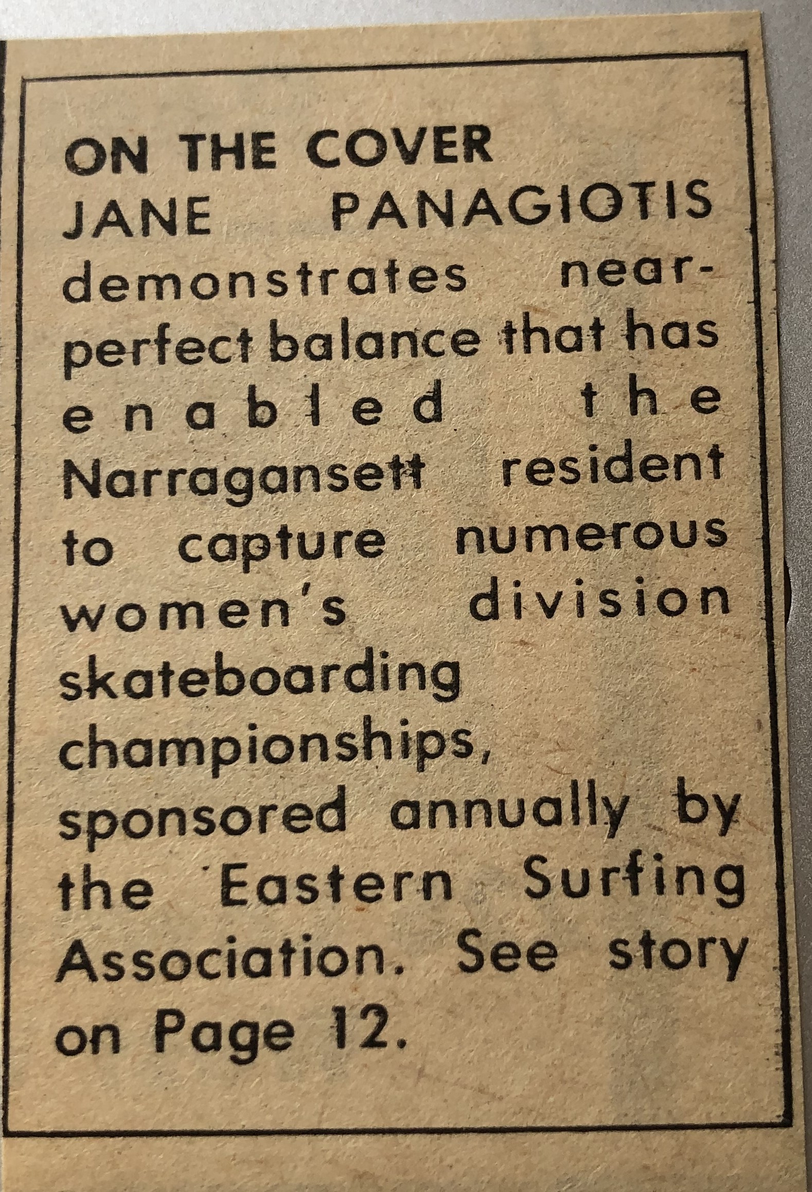Jane was the wife of Peter “Pan” Panagiotis who was a sponsored surfer with the Hobie Surf Team of Narragansett, Rhode Island thanks to Will Somers who opened the Narragansett Surf Shop in 1962 and sold Hobie surf boards exclusively. Two years later, in 1964 the shop was sold to Bill and John Spicer of Stonington, Connecticut and moved to Beach Street.