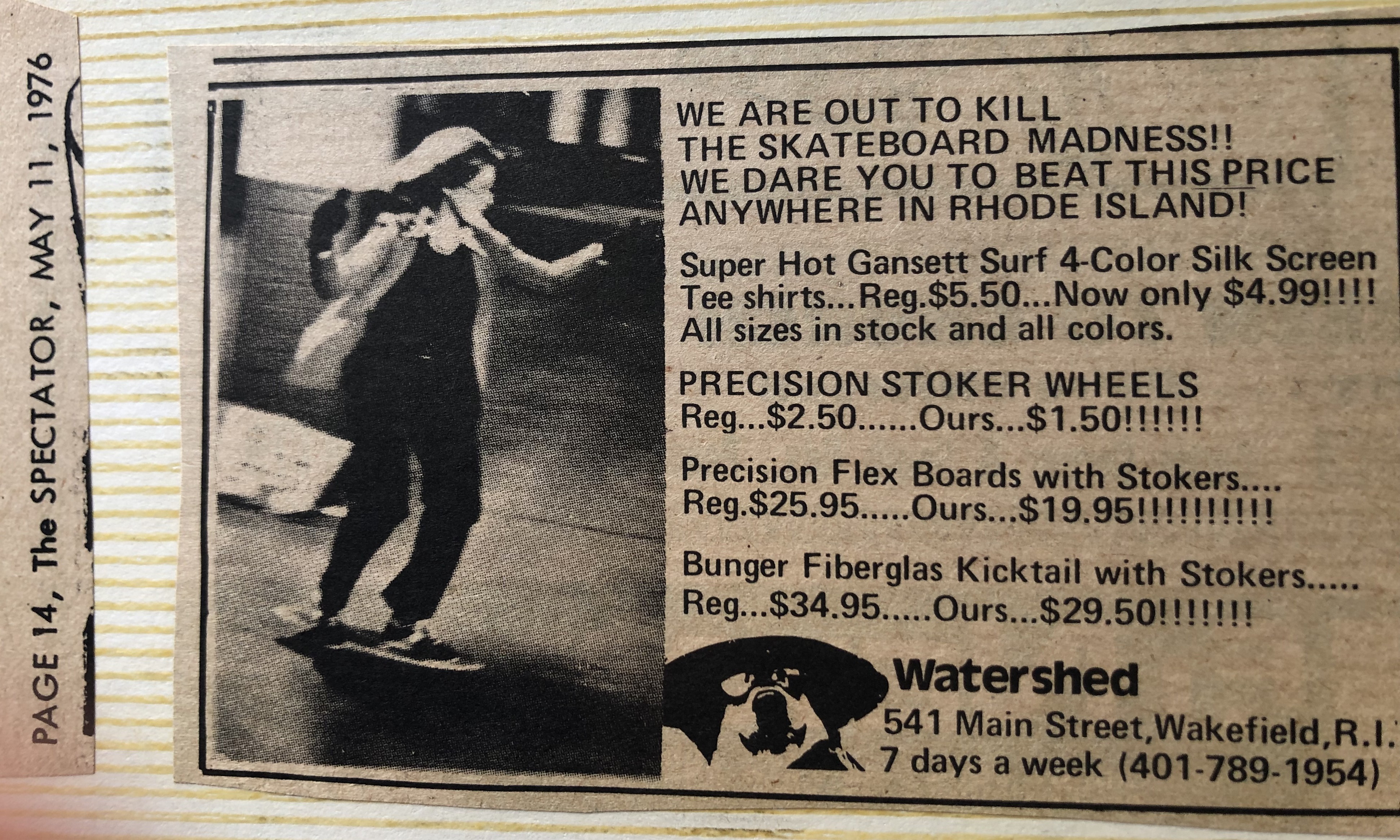 According to the History page for the Narragansett skate and surf shop, “When urban renewal leveled Beach Street in 1971, Peter Pan moved the shop franchises to his house, close by. For several years, under the name Gansett Surf Supplies… He then partnered with Dave Levy, who was a top lifeguard at the town beach, and continued to supply Hobie surfboards, skateboards, and wetsuits to local clientele.” Finally, in 1976 Levy and Pan launched Watershed Surf Shop on Main Street in Wakefield becoming the top Hobie dealer on the east coast.