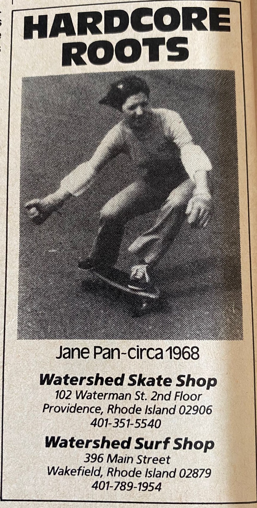 A photo of Jane Pan (short for Panagiotis) from 1968 appeared in an ad for Watershed Skate Shop / Surf Shop out of Rhode Island in the July 1988 issue of Thrasher (*shout out to editor, Michael Burnett for the heads up) giving a nod to the shop’s “hardcore roots.” What I love about this photo is that it’s from 1968, which is period in skateboarding when the industry was practically non-existent, and Jane is still embracing it.