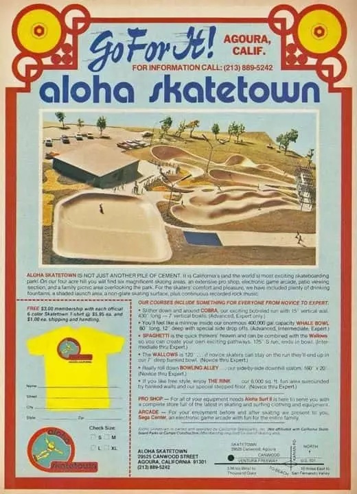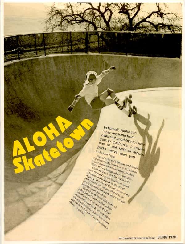 There was also an article about Aloha Skatetown in the June 1978 issue of Wild World of Skateboarding (60-63). Apparently, the big feature was a design that was supposed to mimic the Grand Canyon, not to forget the $4000 sound system (big money in 1978) so that skaters could bring their own cassette tapes and blast their favorite tunes while skating.