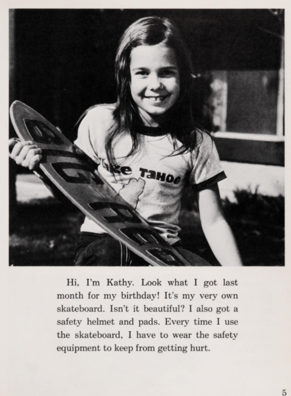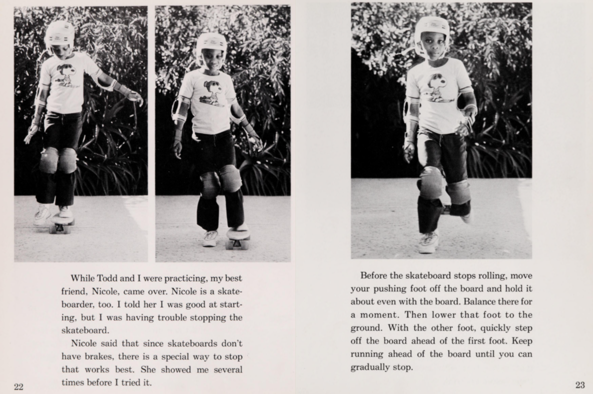 The simple story focuses on a girl named Kathy gearing up to learn how to safely skateboard with the support of her siblings Jay and Lisa, and best friend, Nicole. There’s lots of advice, some basic terms, accessible photos, and just an overall positive vibe.