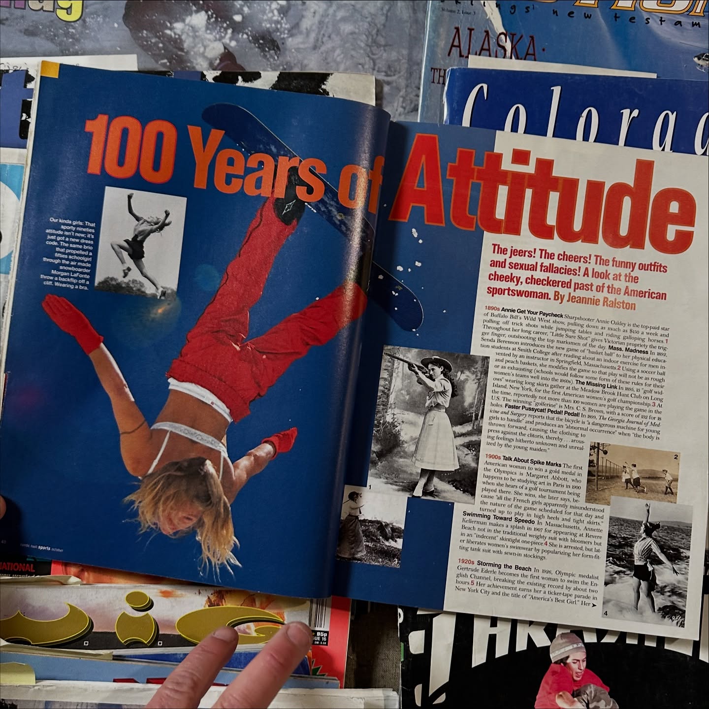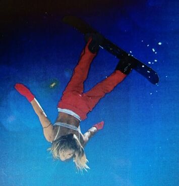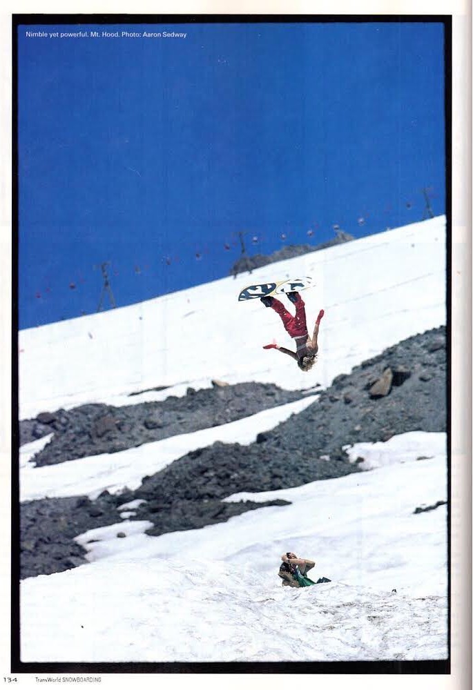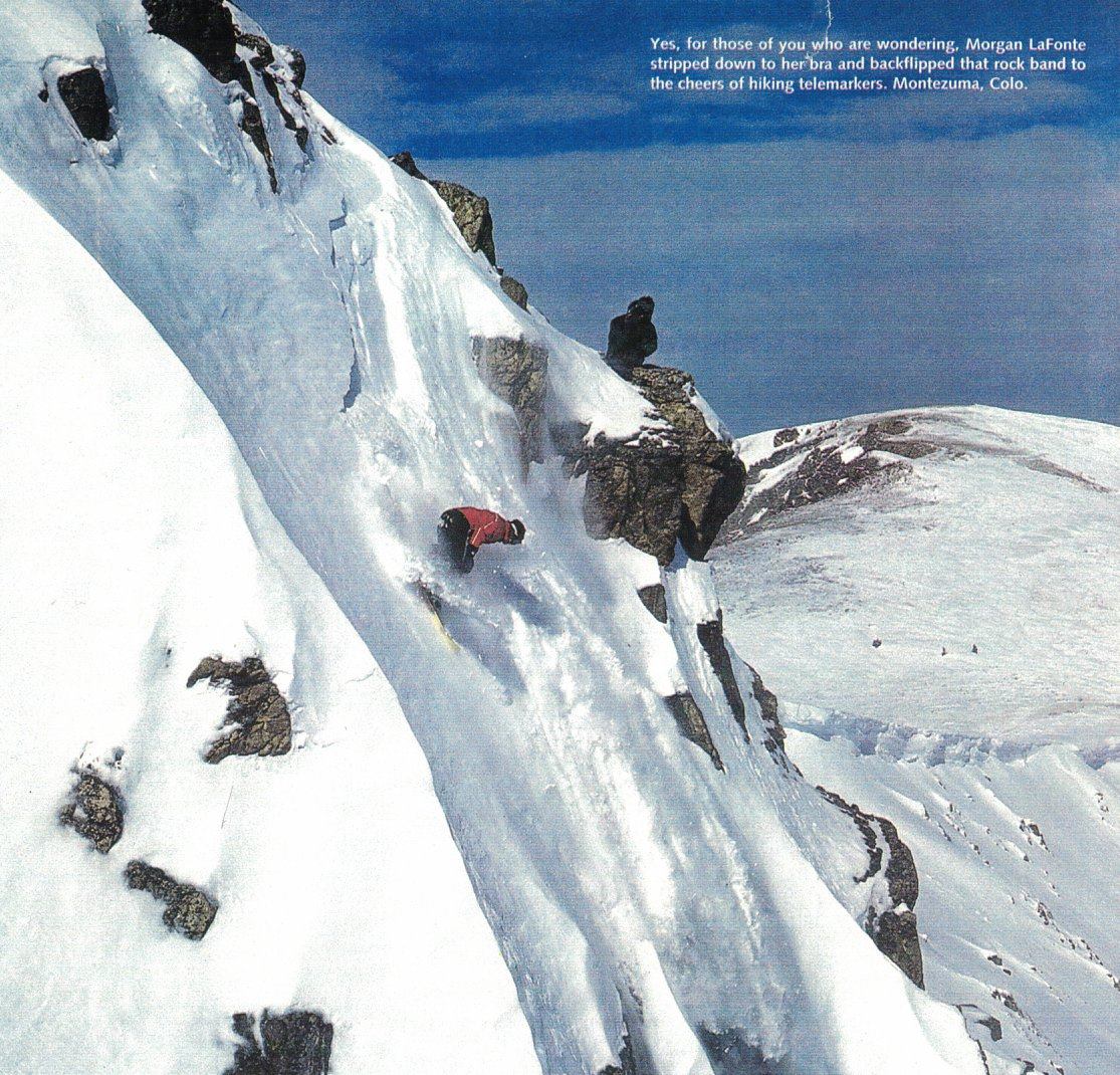 A photo of Morgan by Aaron Sedway performing a backflip at Mt Hood, rocking red snowboard pants and a bra was pretty iconic. It was published in the February 1996 issue of TransWorld Snowboarding magazine. She was also the first woman snowboarder to have a double backflip captured on film for her part in No Man’s Land, and featured in a Sony PlayStation video game!